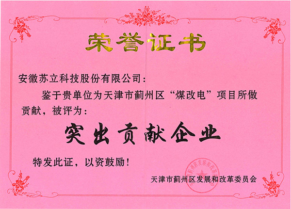 天津市薊州區(qū)“煤改電”項目突出貢獻企業(yè)